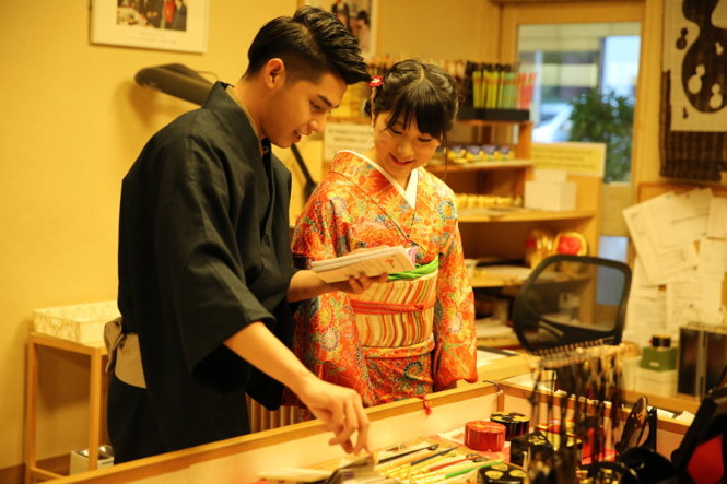 | Noo Phước Thịnh quay phim cùng bạn diễn người Nhật tại Nhật. Ảnh tư liệu. |