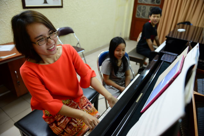 | Sa Huỳnh dạy đàn cho con gái, bé Moon, 4 tuổi - Ảnh: Quang Định |