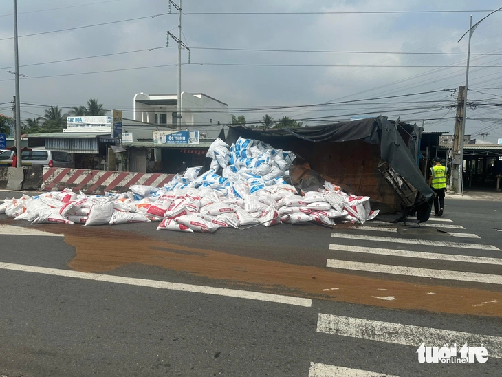 Tại hiện trường, chiếc xe tải nằm chắn ngang quốc lộ, án ngữ cả hai hướng đi từ TP.HCM về miền Tây và chiều ngược lại. Hàng chục bao thức ăn thủy sản trên xe tải bị đổ tràn ra mặt đường. Một biển báo giao thông gần đó cũng bị hư hỏng sau vụ tai nạn.